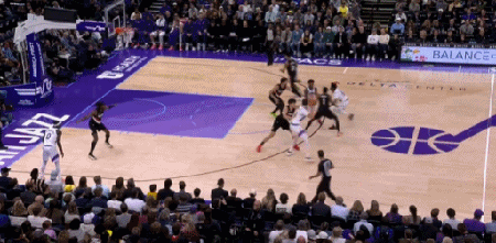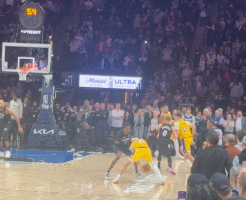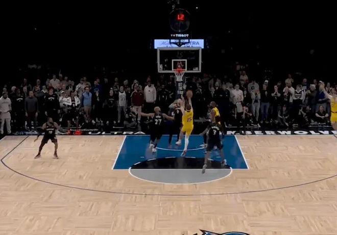 比賽最后6.6秒,落后1分的湖人命懸一線, 里夫斯接球后略一停頓,化身一道黃色閃電, 利刃般刺穿人墻縫隙 !電光石火間,他騰空而起,面對(duì)遮天蔽日的巨掌,手腕輕抖如拈花——